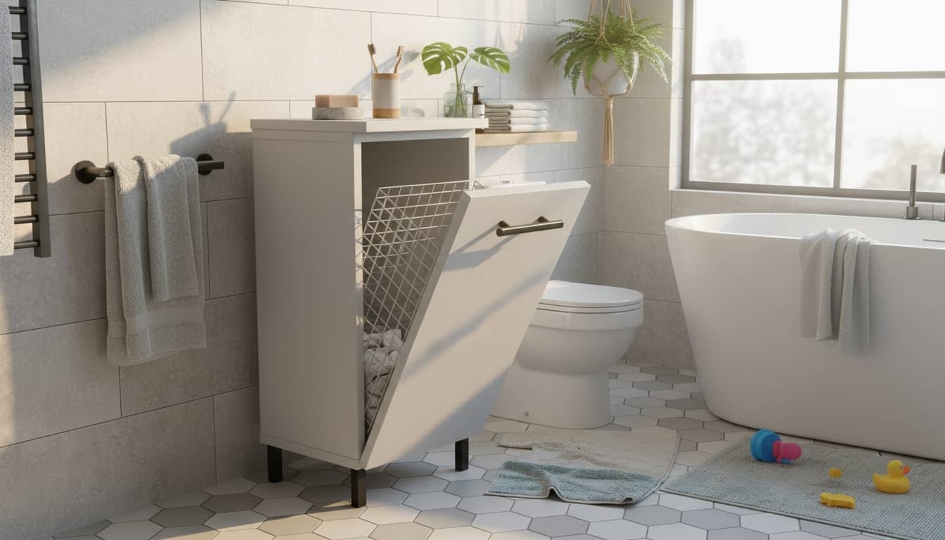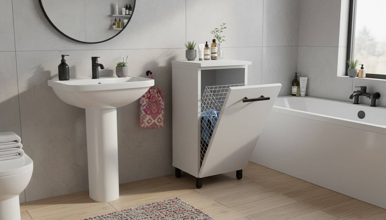✔️ Funkcjonalny kosz na pranie – schowany, ale zawsze pod ręką