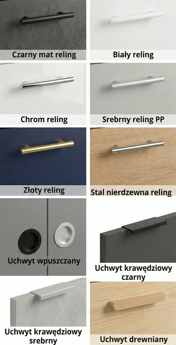 - Systemy otwierania — klasyczne uchwyty (również w kolorze złota!), minimalistyczne listwy krawędziowe lub nowoczesny system TIP-ON (otwierasz dotykiem).